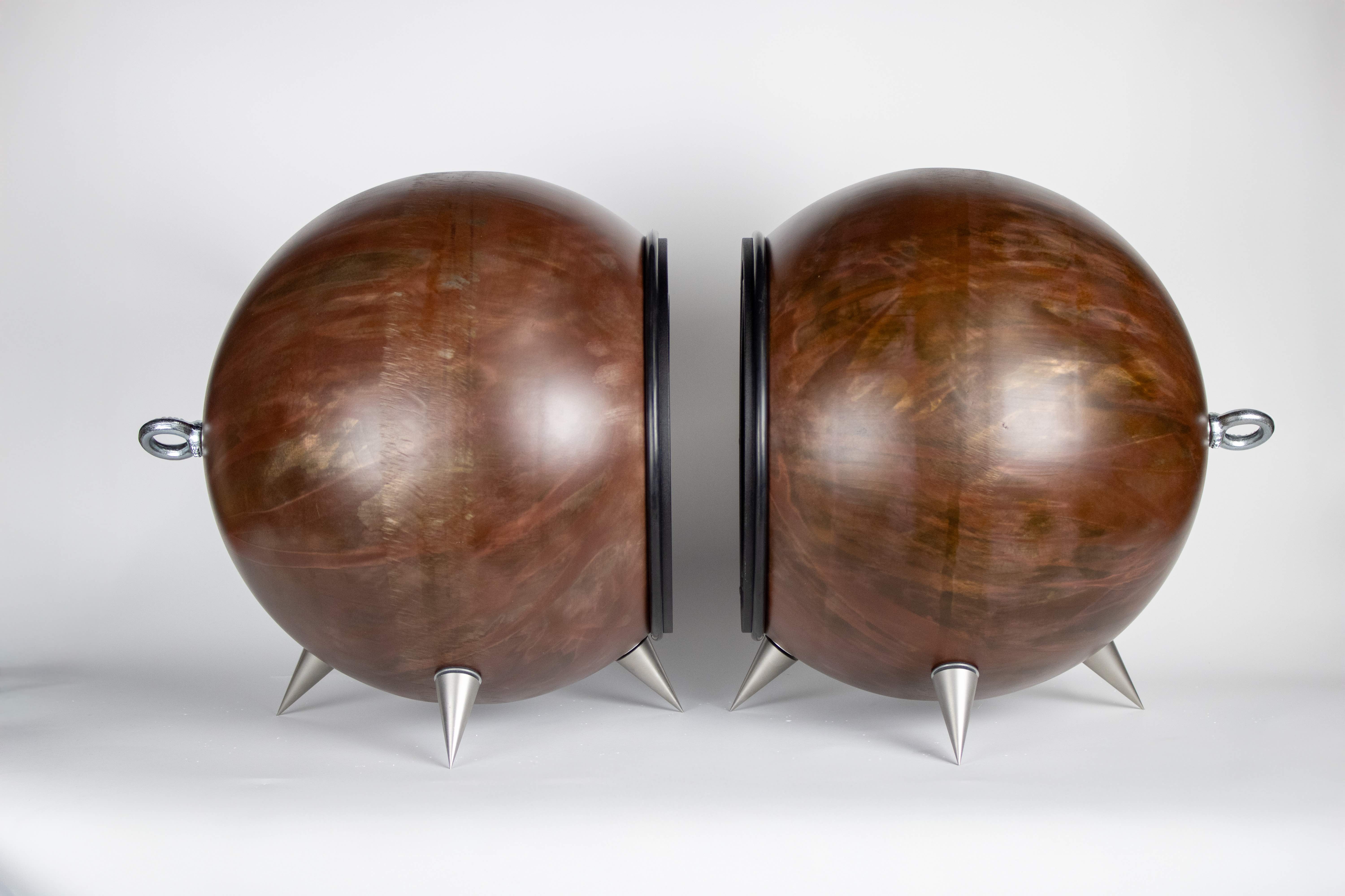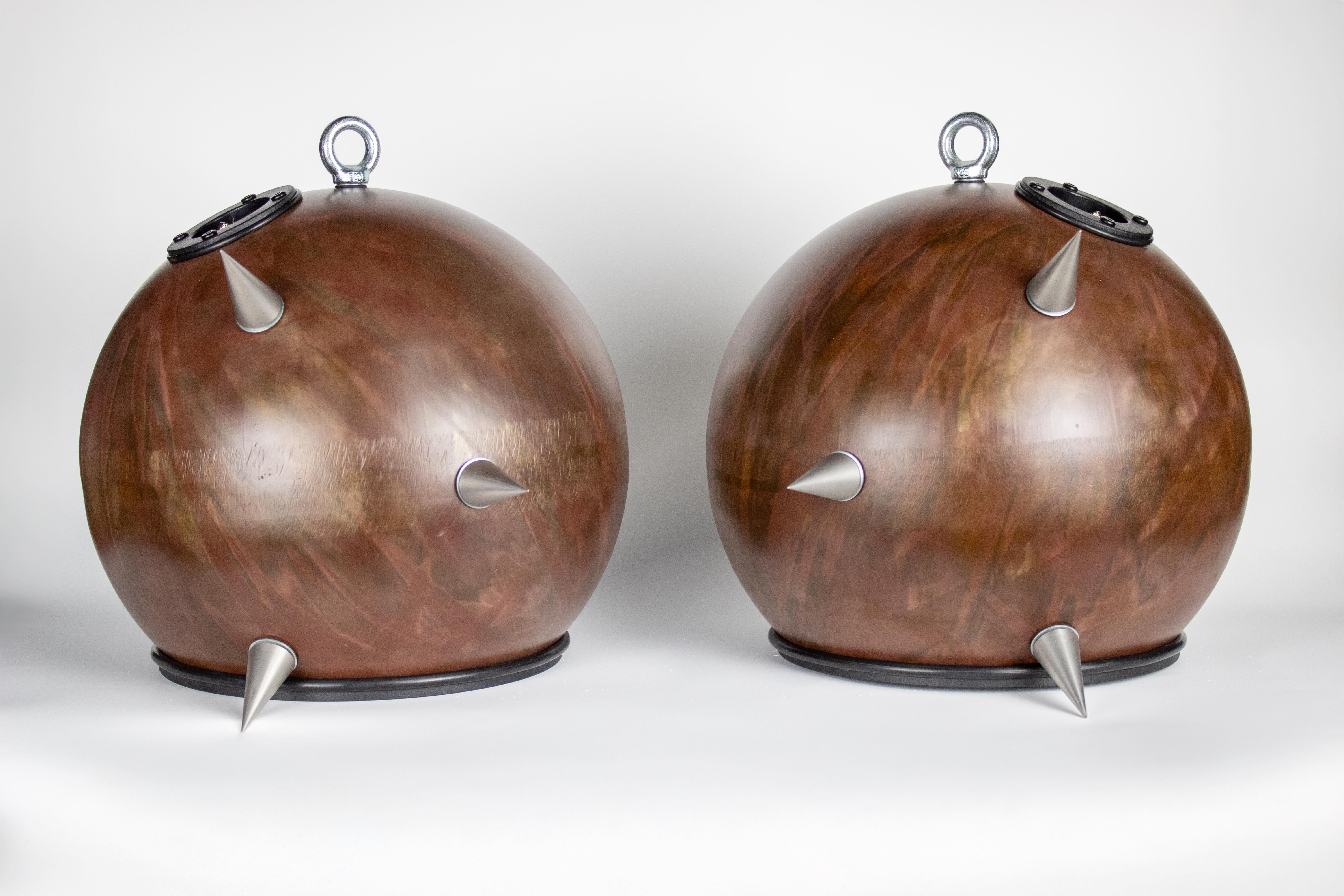 Available as pendant (hanging) or bookshelf (freestanding). Tool black and red oxide patinas pictured below. Custom finish, diameter, and driver selection available upon request.